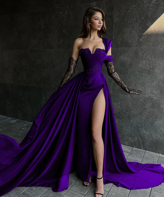 Charming Strapless Slit Beaded Black Prom Dress With Lace Sleeves | Zelldresses