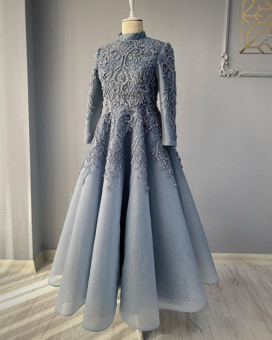 Blue prom dress long Fairy ball gown dress Long sleeves prom dress Sparkle rhinestone dress Romantic star print evening dress cg24826
