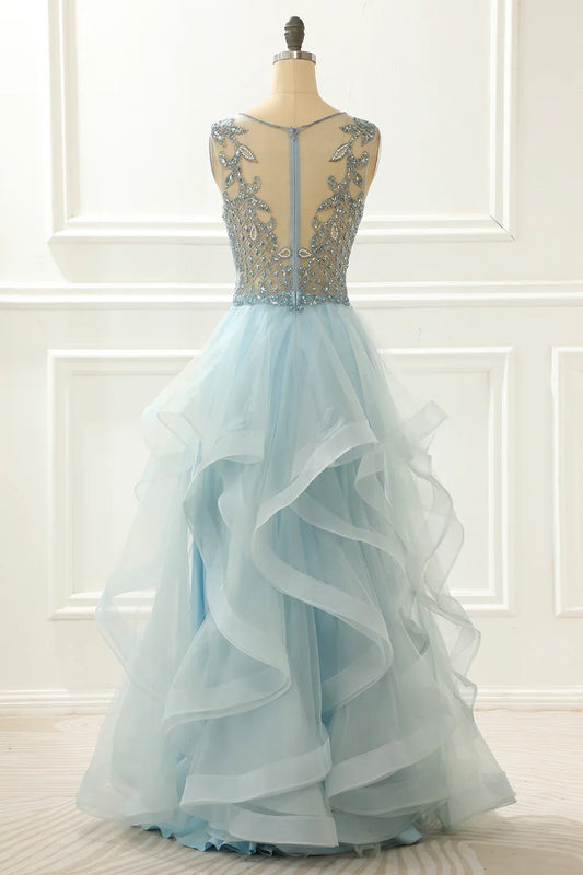 A-Line Tiered Corset Light Blue Prom Dress With Puff Sleeves