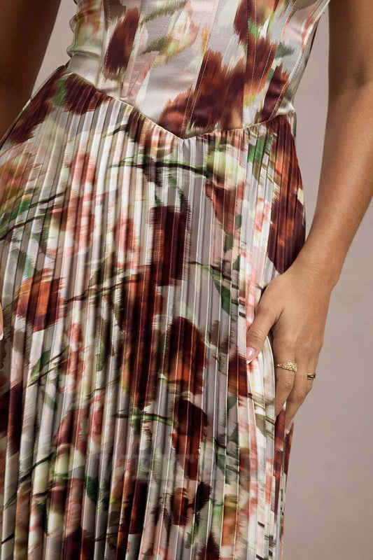 Dress Cream Floral Print Satin Corset Style Midi Dress Prom Dress Sweetheart A-line Fairy-Tale Lace Up Bridesmaid Dress