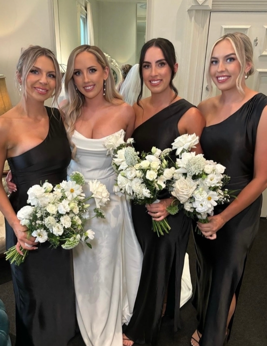 Pretty Sheath One Shoulder Black Satin Bridesmaid Dress Evening Dress with Slit SH3206