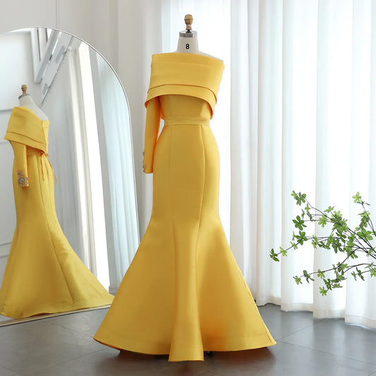 Yellow Satin Luxury Dubai Evening Dress with Cape 2025 SS455