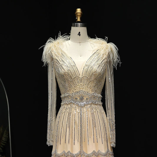 Stunning Crystal Blue Long Sleeves Evening Dress with Feather SS018