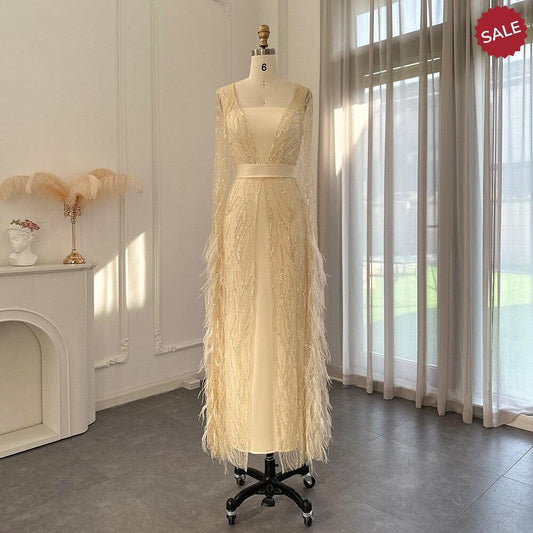 Feathers Light Yellow Evening Dresses with Cape Sleeves SS420