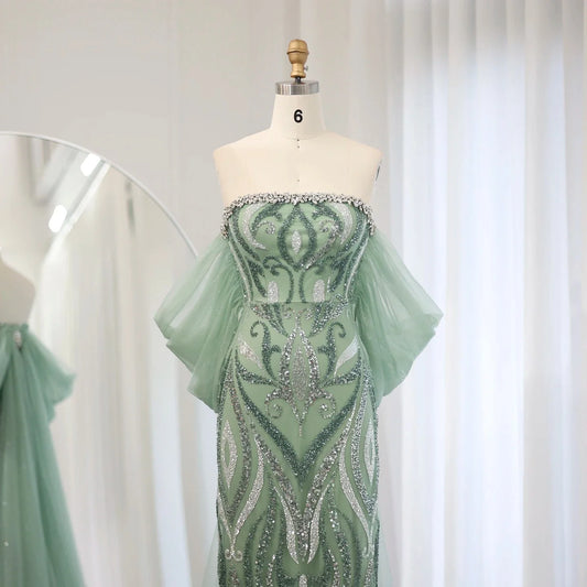 Turquoise Beaded Mermaid Evening Dress with Cape Sleeves SS028