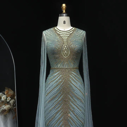Turquoise Crystal Mermaid Dubai Evening Dresses with Cape Sleeves SS666