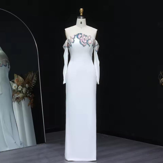 White Off Shoulder Beaded Evening Dress SS512