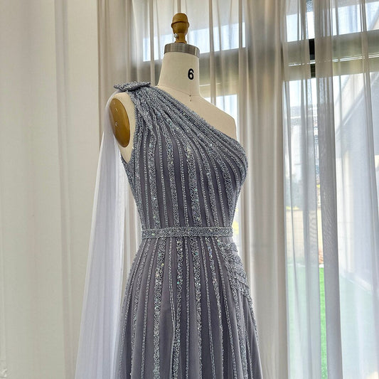 Yellow Beaded One Shoulder Yellow Evening Dress with Cape SS423