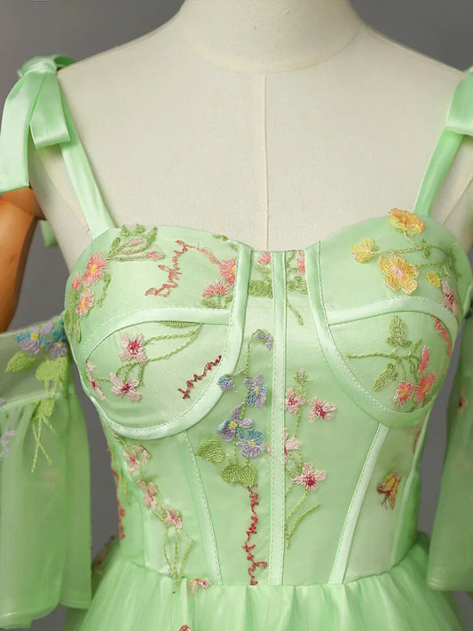 Light Green Tulle Floral Straps Long Formal Dress, Light Green Prom Dress TP987