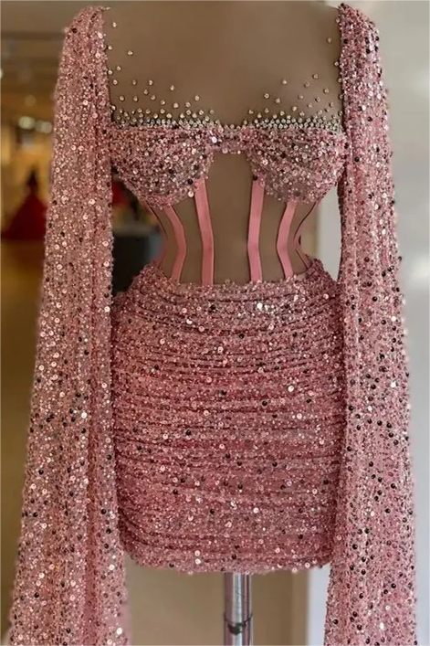 Stunning Pink Sequins Long Sleeves Slim Short Homecoming Dress with Beadings HC0065