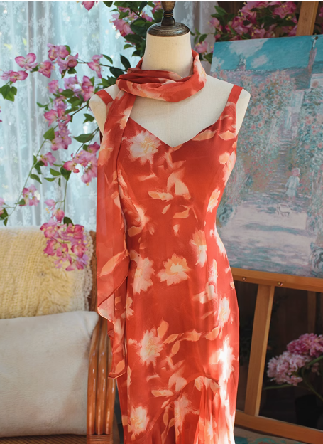 Beautiful Pink Printed Oil Painting V-neck Chiffon Mermaid Prom Dress P3472
