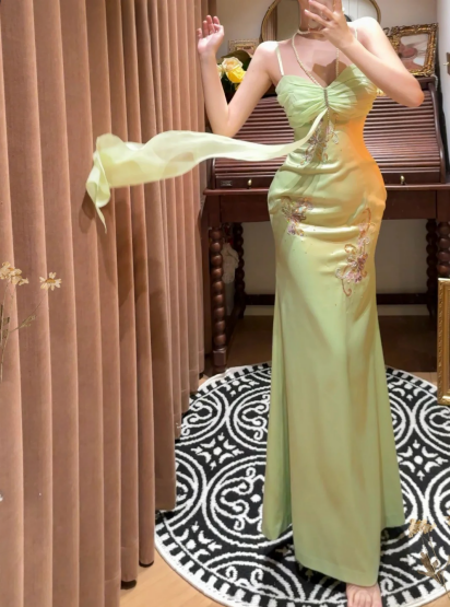 Elegant Green Spaghetti Strap Beaded Chiffon Mermaid Prom Dress P3491