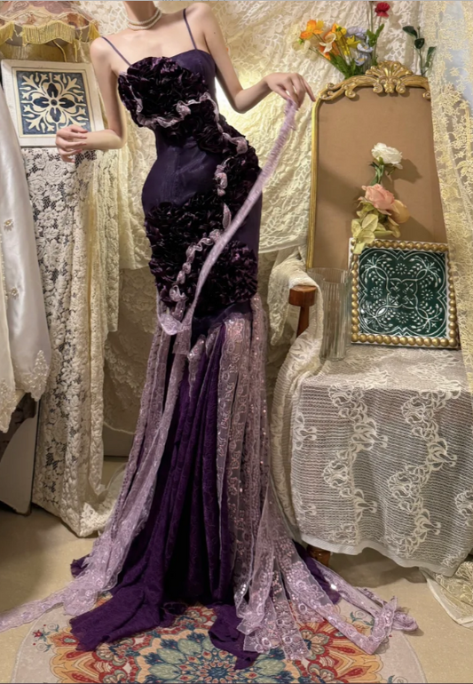 Charming Purple Heavy Strap Floral Lace Mermaid Prom Dress P3752
