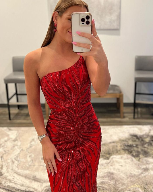 Mermaid Sequins Red One Shoulder Prom Dress With Slit