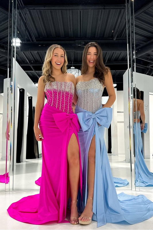 Charming Sky Blue Satin Strapless Sleeveless Long Split Prom Dress with Sequins | Zelldresses