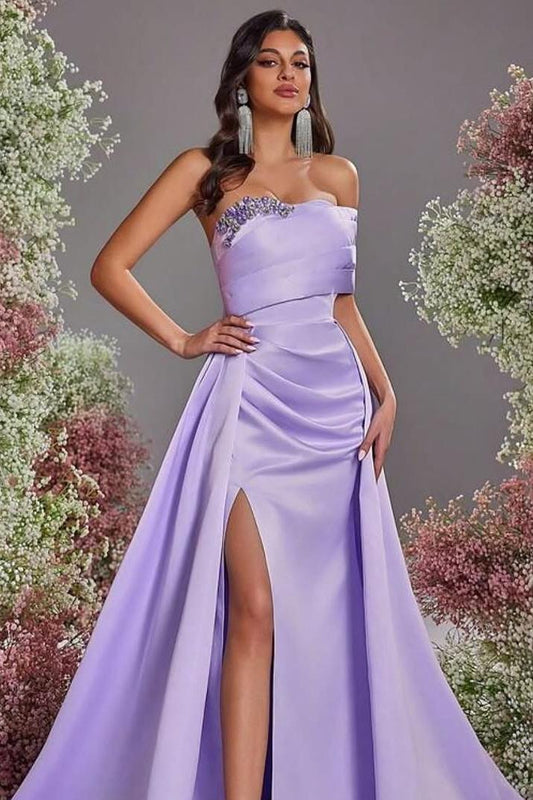 Charming Lilac Satin Off the Shoulder Strapless Long Split Prom Dress with Beadings | Zelldresses