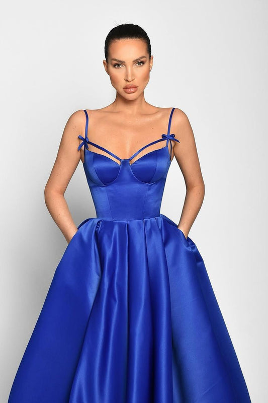 Charming Royal Blue Satin Sleeveless Spaghetti Strap Long Split Prom Dress with Pocket | Zelldresses