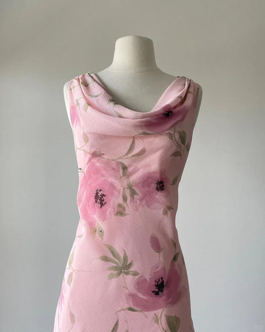 Cute Pink Printed Swing Neck Sleeveless Chiffon Prom Dress P3395
