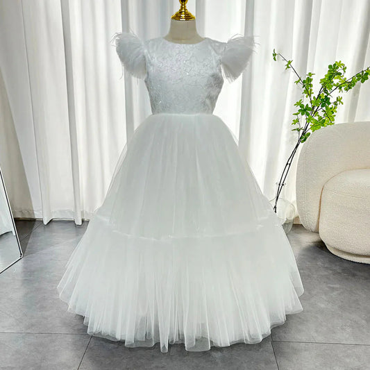 Elegant White Girl Dress Feathers Princess White Gown for Kids J169
