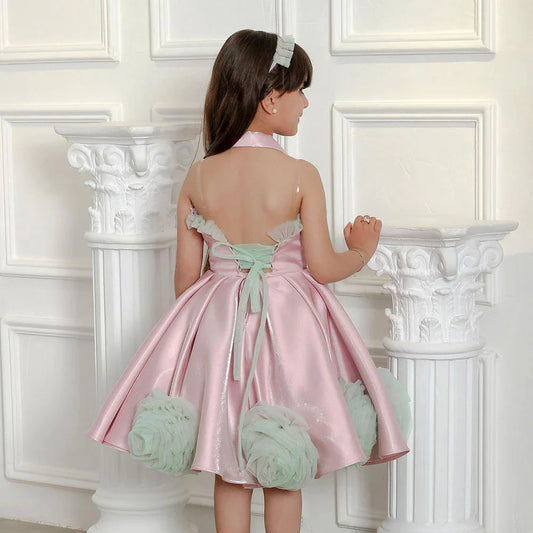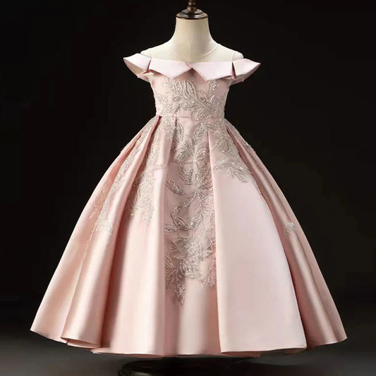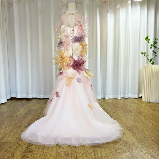 Elegant Arabic Pink Girl Dress with Flowers Princess Party Gown J254