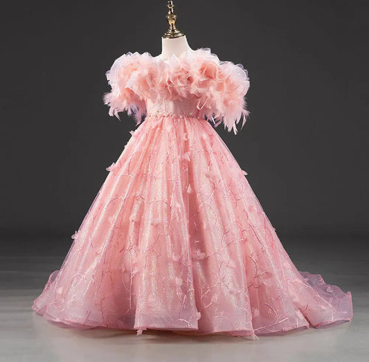 Luxury Blush Pink Girl Dress Feathers Beaded Princess J391