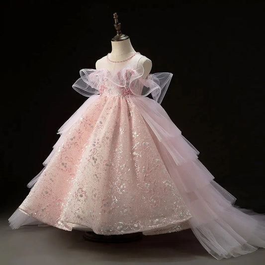 Luxury Pink Flower Girl Dress Appliques Sequined Princess J129