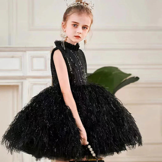 Sparkly Black Arabic Girl Dress Feathers Baby Kids Princess J175