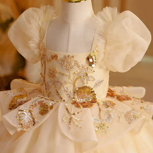 Elegant Beige Dubai Girl Dress Beading Arabic Princess Kids J243