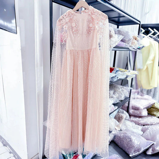 Luxury Pearl Arabic Girl Dress Applique Beaded with Cape J071