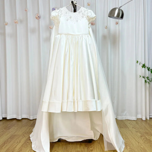 Luxury White Girl Dress Beaded Pearls Satin Princess Kids Wedding J153