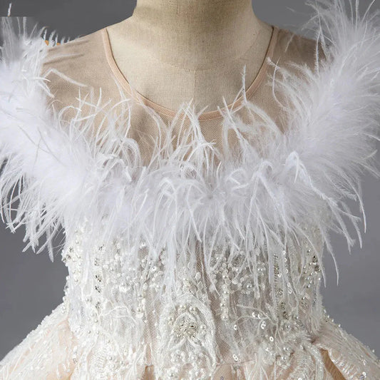 Luxury Champagne Girl Dress Feathers Lace Bow Princess Kids J260