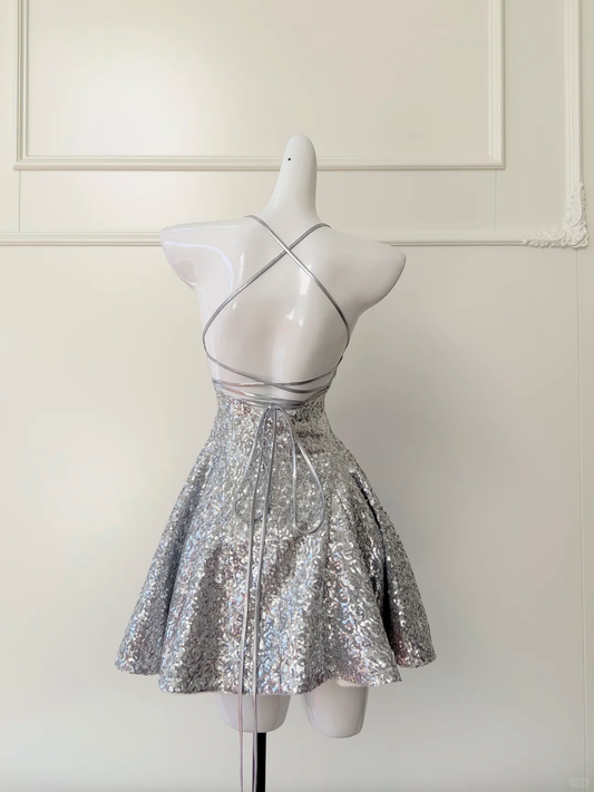 Shiny A Line Spaghetti Strap Silver Sequin Short Open Back Homecoming Dress Cocktail Dress SH3005