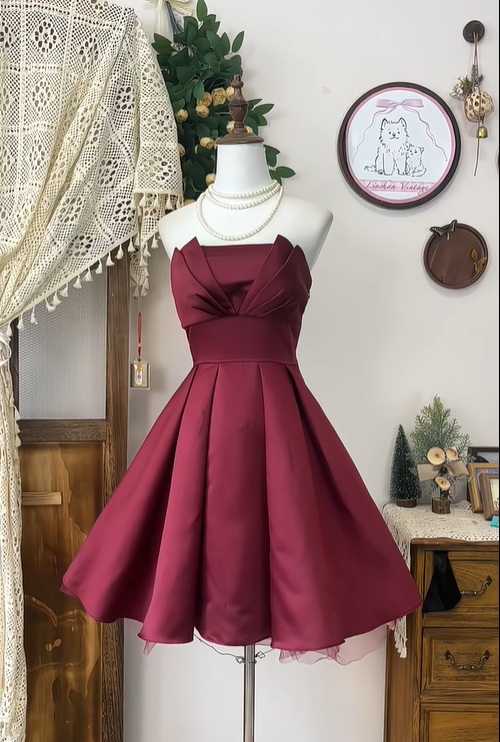 Simple A Line Strapless Burgundy Satin Short Homecoming Dress Cocktail Dress SH3010