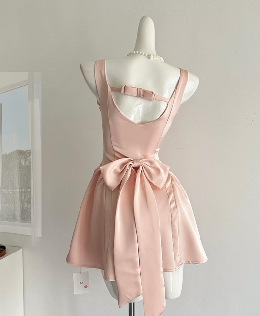 Cute A Line Straps Bow Light Pink Satin Short Homecoming Dress Cocktail Dress SH3052
