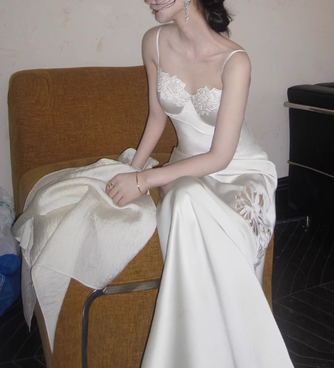 Simple Mermaid Spaghetti Strap Lace Satin Long Party Dress Evening Dress SH3133