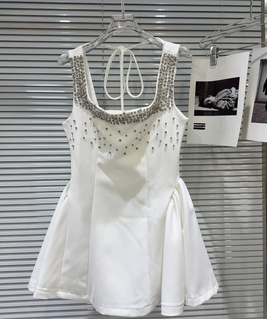 Cute A Line Strap Rhinestone White Satin Short Homecoming Dress Cocktail Dress SH3118