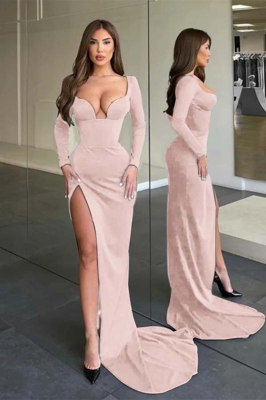 Long Sleeves Long Mermaid High Split Prom Dress With Pleated JQ0020