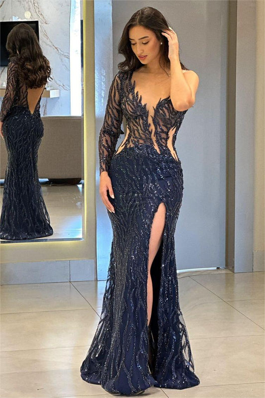 Gorgeous One Shoulder Mermaid Sequins Slit Prom Dress Beadings with Long Sleeve ED0255
