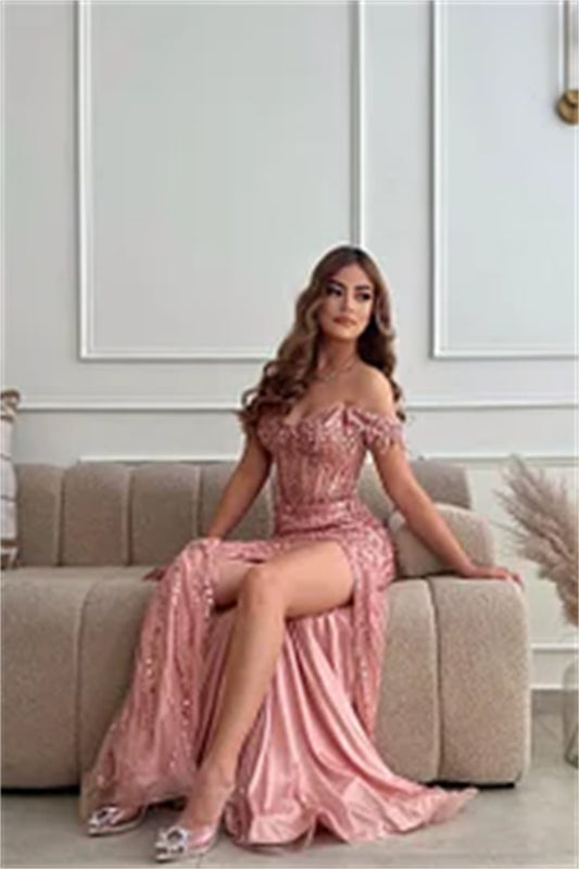 Exquisite Pink Off-the-Shoulder Glitter High Slit Prom Dress MM0350