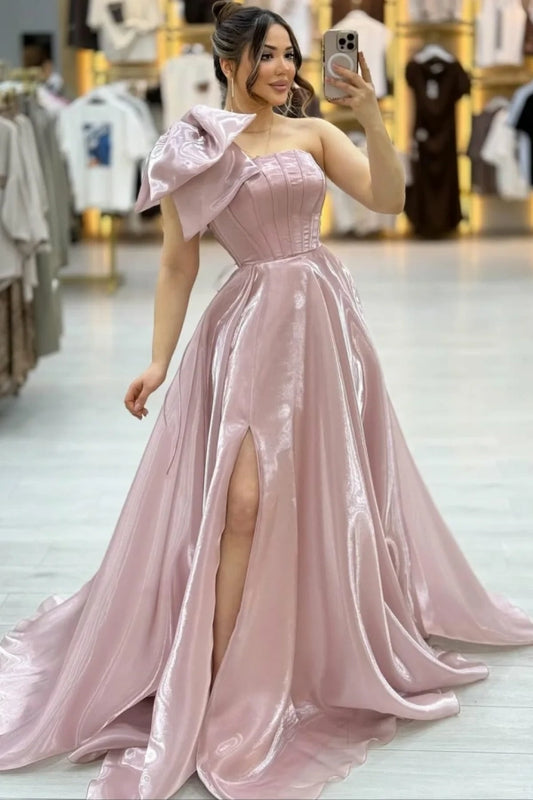 Glamorous Pink One Shoulder Sleeveless Split Prom Dress with Bow | Zelldresses