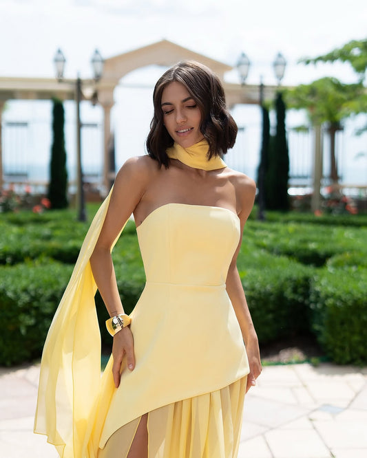 Glamorous Daffodil Strapless Sleeveless Split Prom Dress with Scarf | Zelldresses
