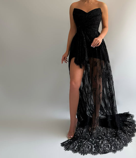 Glamorous Black Lace Sweetheart Sleeveless Split Prom Dress with Gloves | Zelldresses