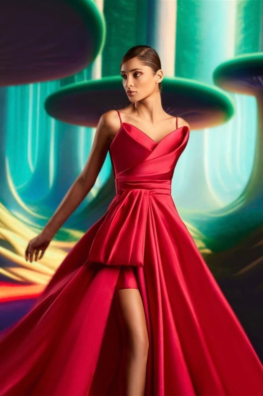 Exquiste Red Satin Sleeveless Spaghetti Strap Long Split Prom Dress with Pleated | Zelldresses