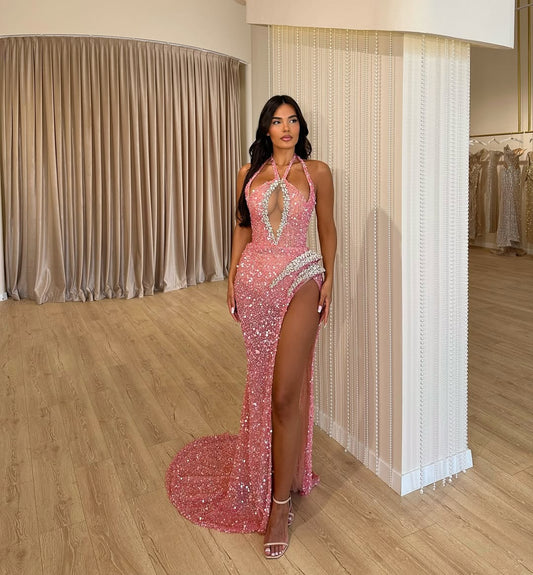 Exquisite Pink Sequins Halter Sleeveless High Split Prom Dress | Zelldresses