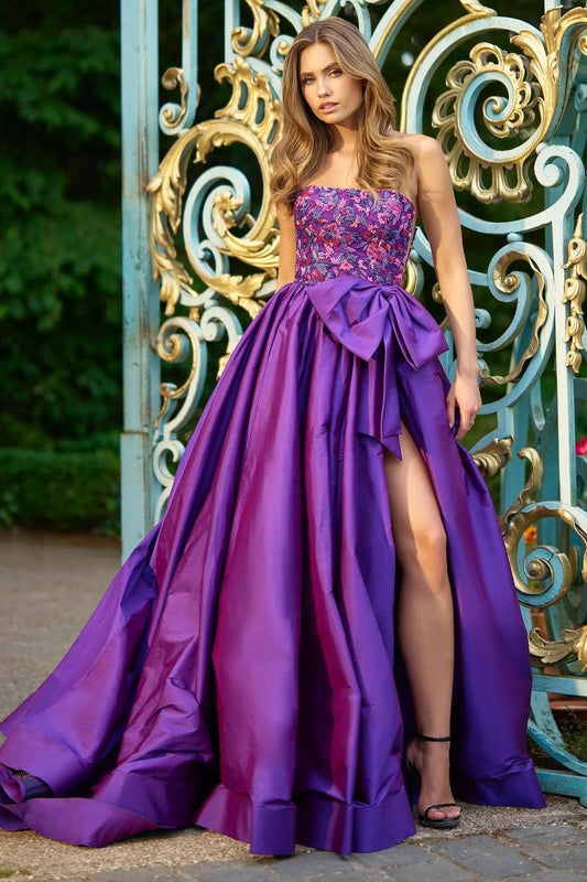 Glamorous Purple Satin Embroidery Strapless Sleeveless Split Prom Dress with Bow | Zelldresses