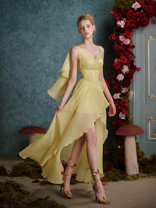 Gorgeous Daffodil Chiffon Sleeveless Split Prom Dress with Ruffles | Zelldresses