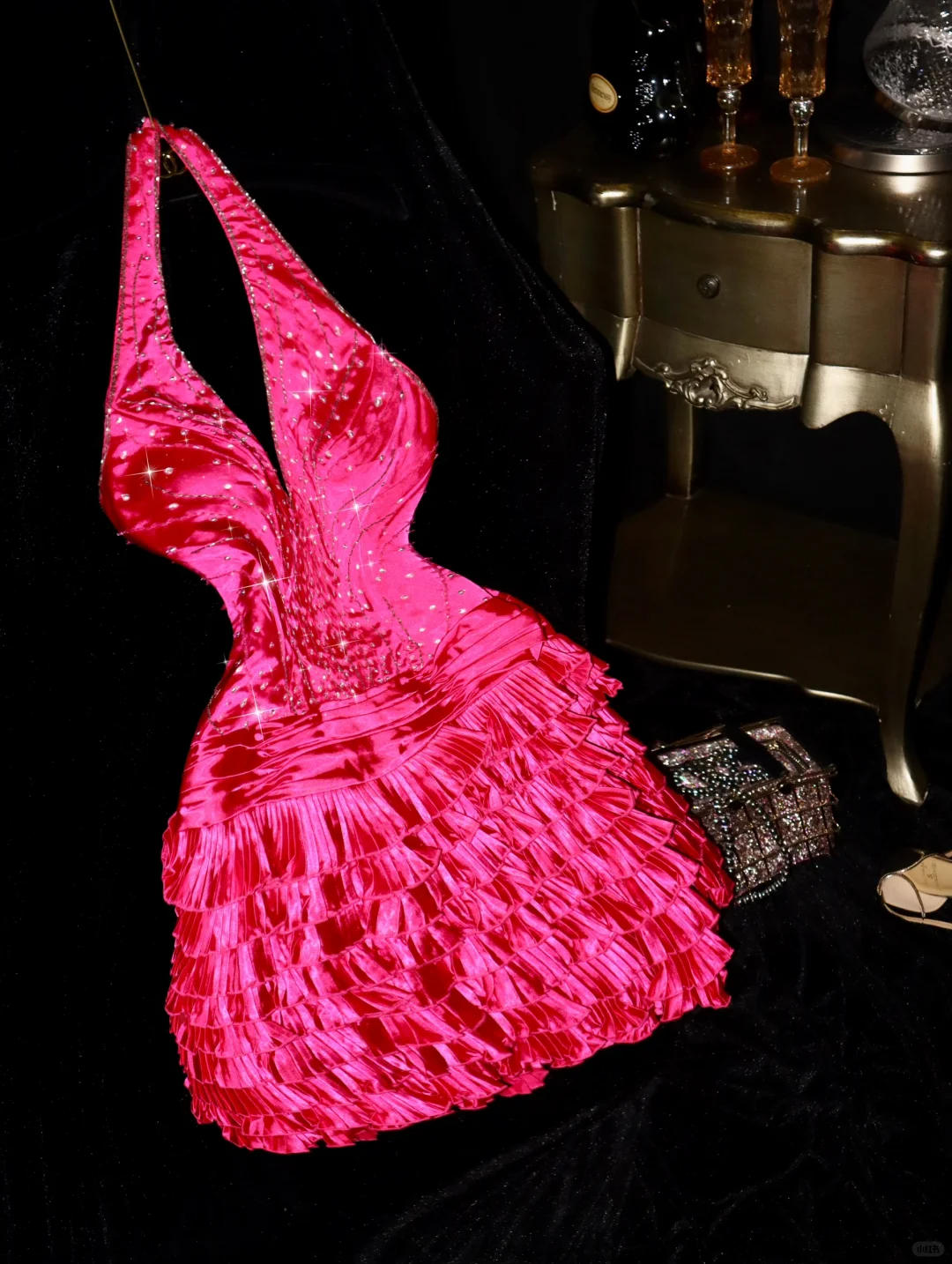 Barbie Pink Cute A Line Halter Beaded Layered Satin Short Homecoming Dress Party Dress SH3049