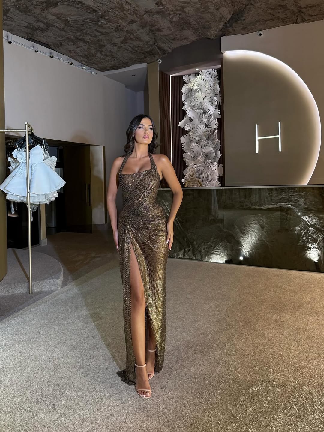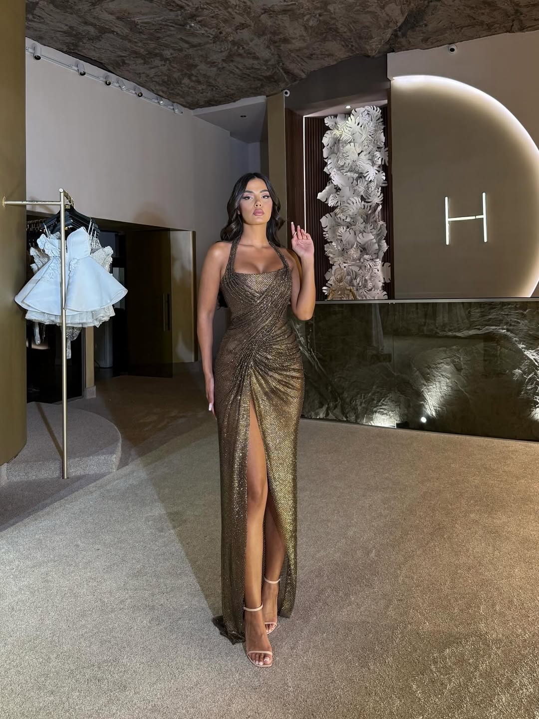 Chic Brown Sequins Halter Sleeveless Split Prom Dress with Pleated | Zelldresses