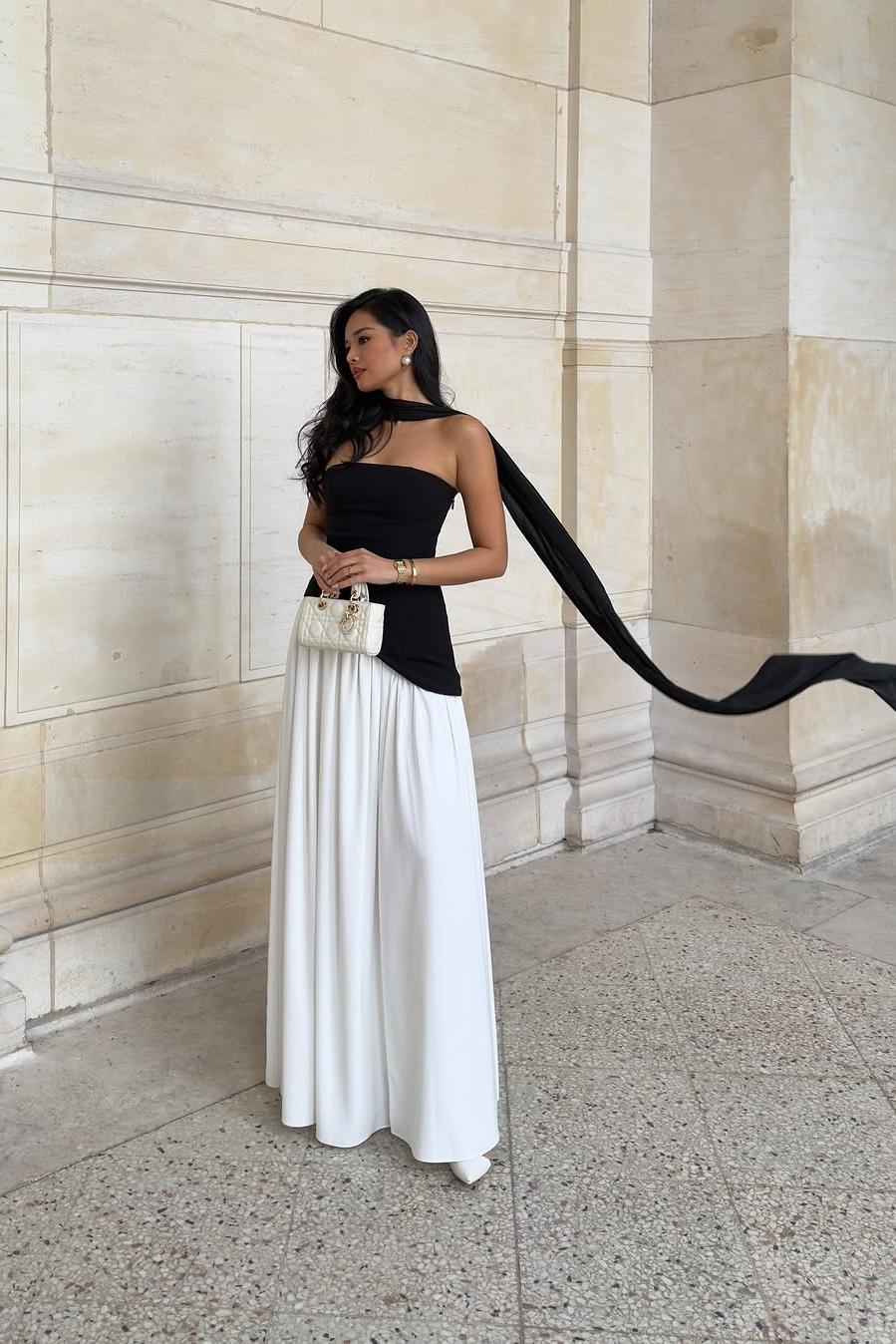 Elegant Black White Satin Strapless Sleeveless Long Split Prom Dress with Scarf | Zelldresses