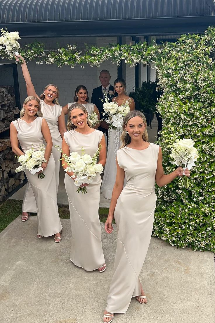 Elegant Sleeveless Ivory Satin Long Wedding Guest Dress Formal Bridesmaid Dress D1113